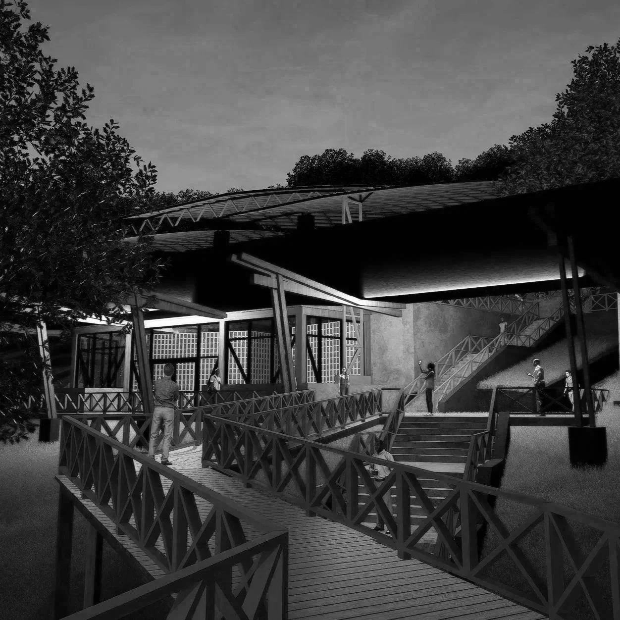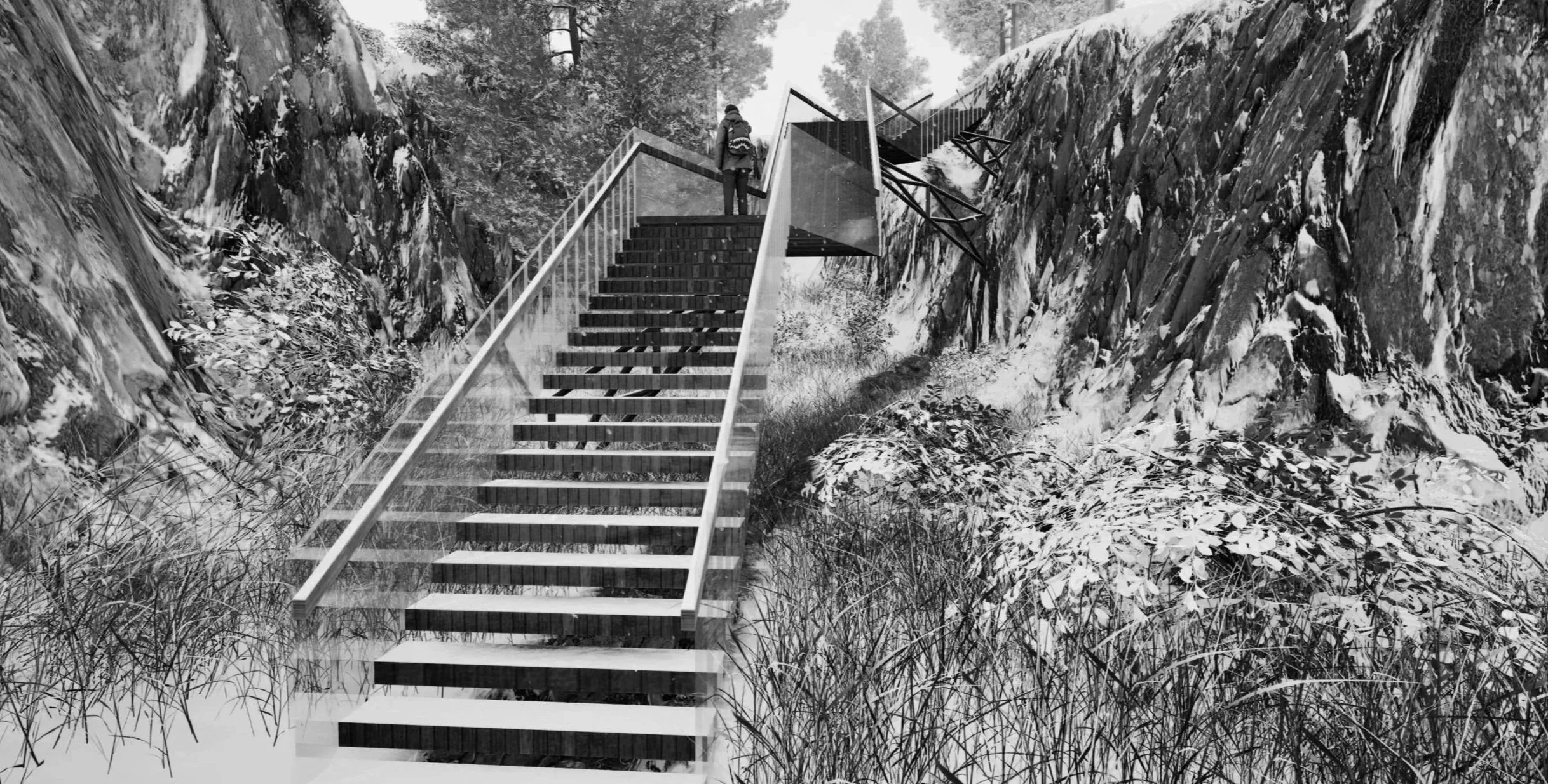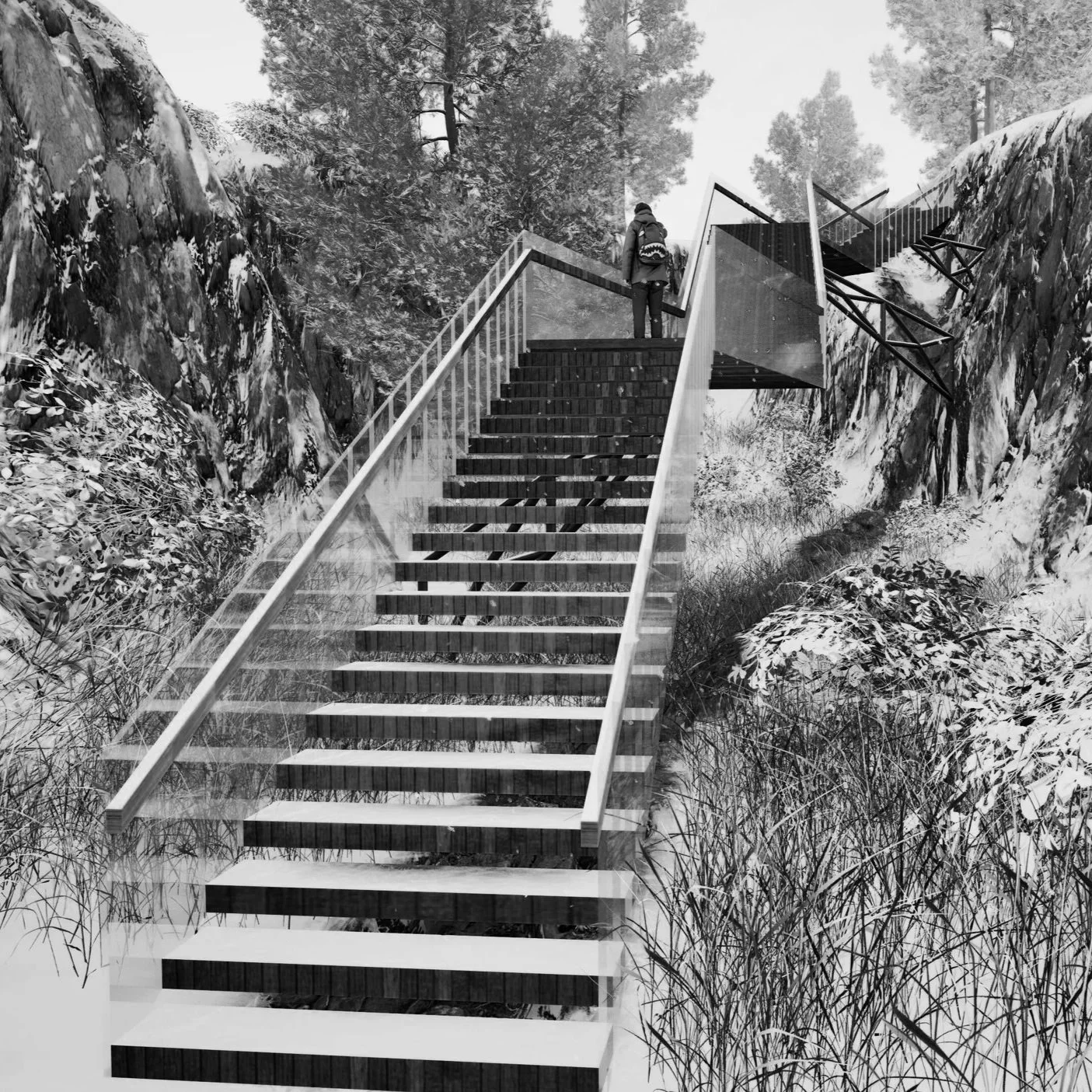 Our class was assigned with developing a staircase with parametric capabilities using just a Grasshopper script. this staircase is highly parametric with each flight of stairs and landing being able to rotate up to 45 degrees. The stair system can consist of any number of flights. Each flight of stairs has its own controls. Flights can vary from 1 step up to the maximum allowable code height. Under each landing is a steel support that cantilevers to the nearest point on the terrain.
