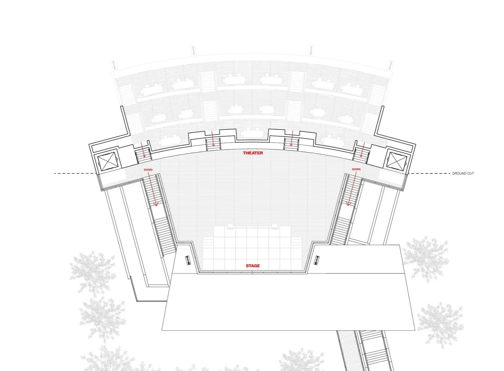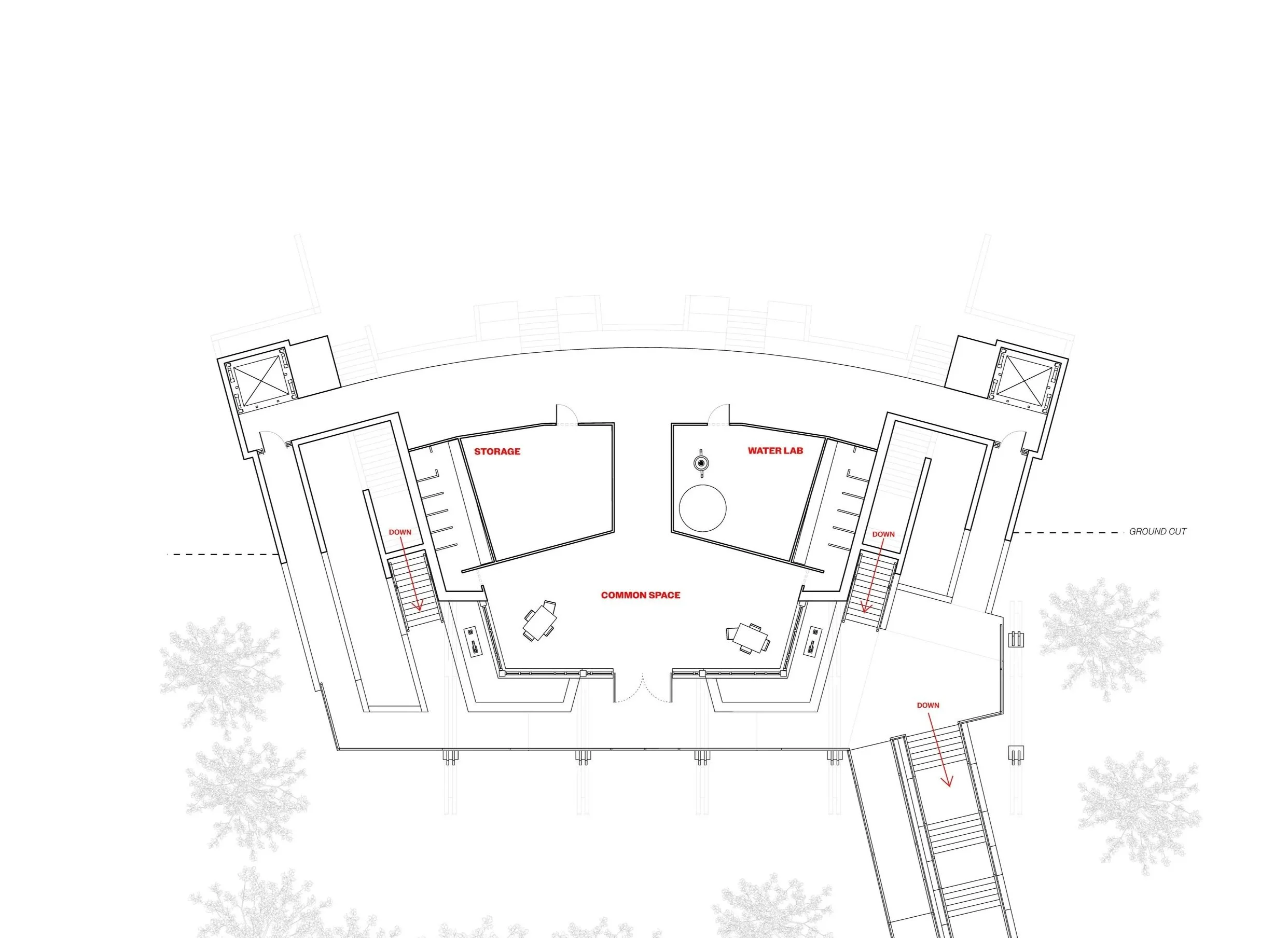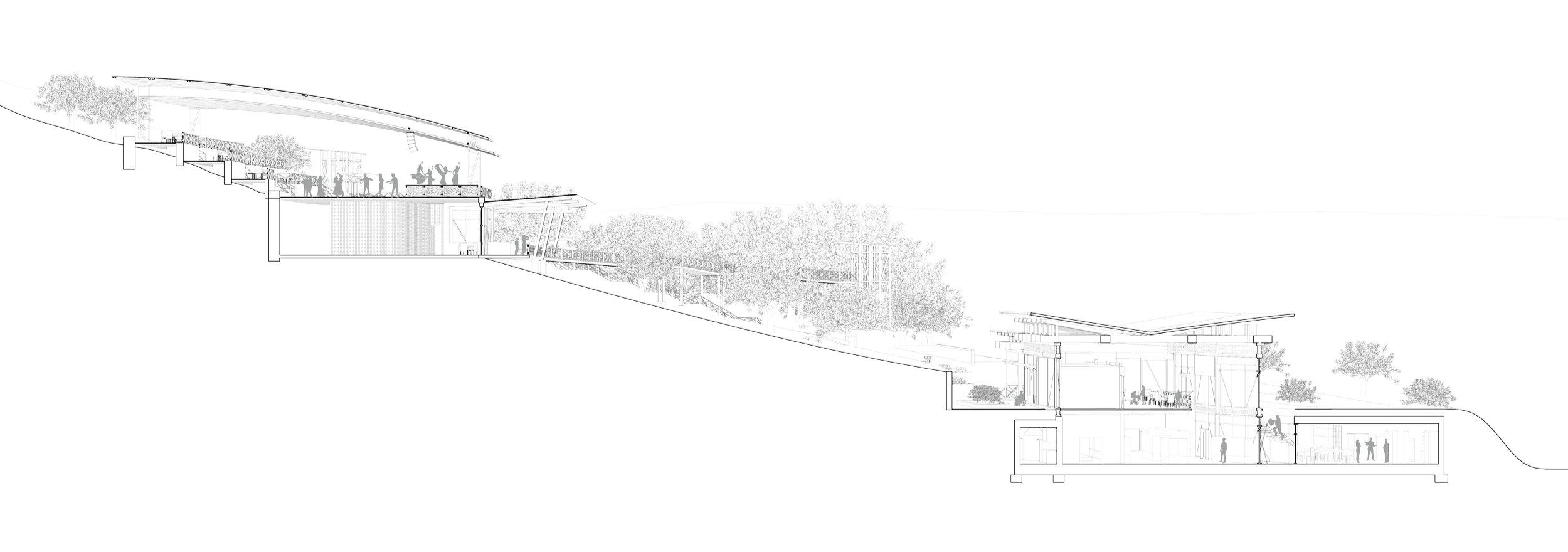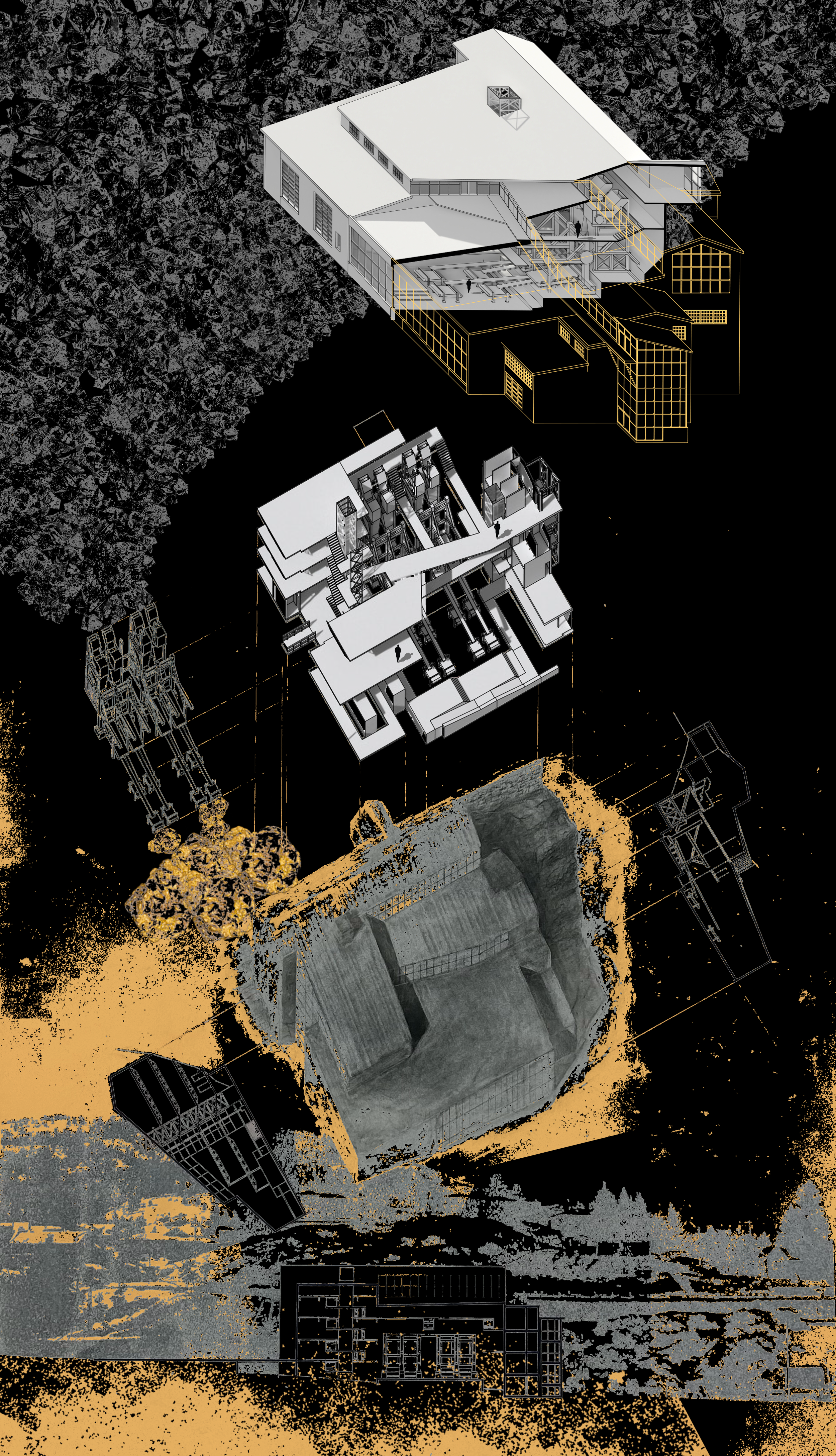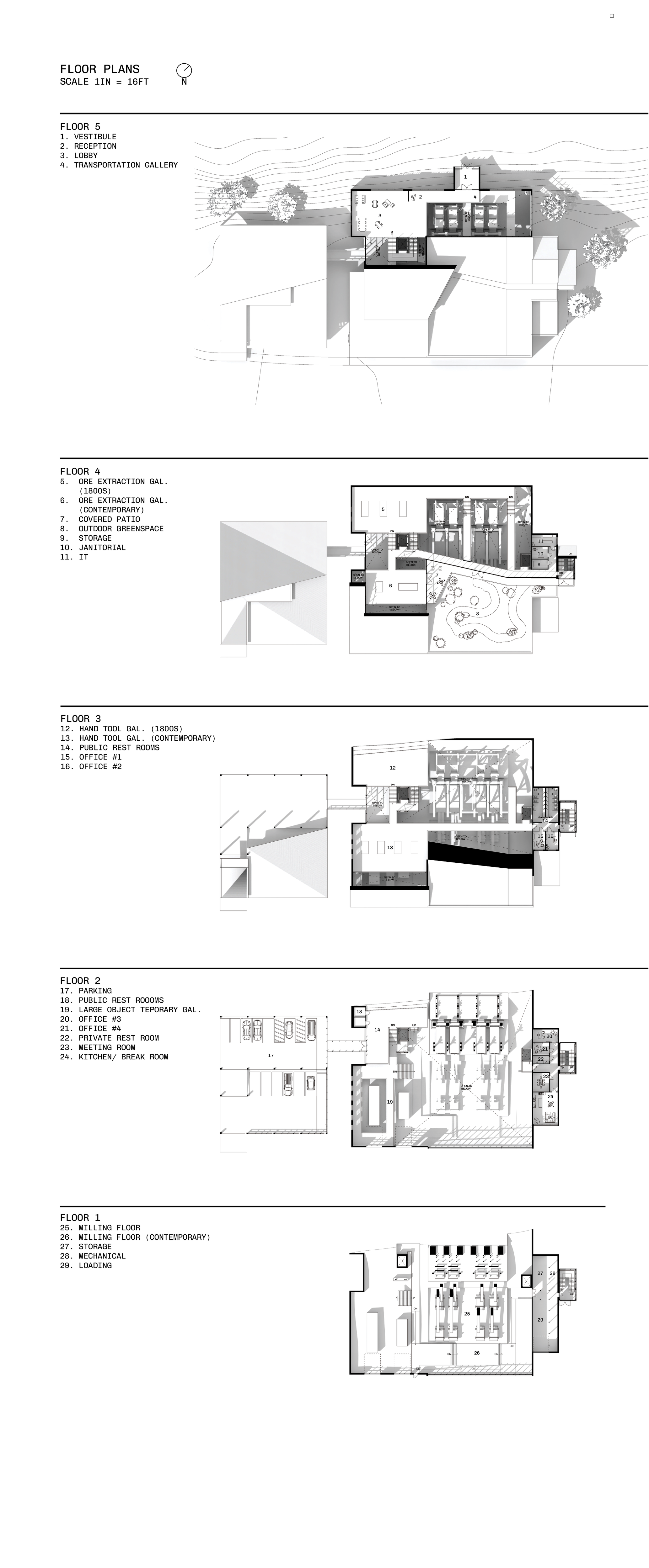 the concept of a gold mining museum comes from Helena’s rich history of gold mining predating the state of Montana. After a deep research of 1800s gold mills a design was formed based on my understanding of how these structures conform to the hillsides on which they sit. looking at the program of a museum and that of a gold mill I created and interior function that works like that of a gold mill but rather than processing ore downward through machines, users are guided through an entrance on the top level and then downward through gallery spaces.
