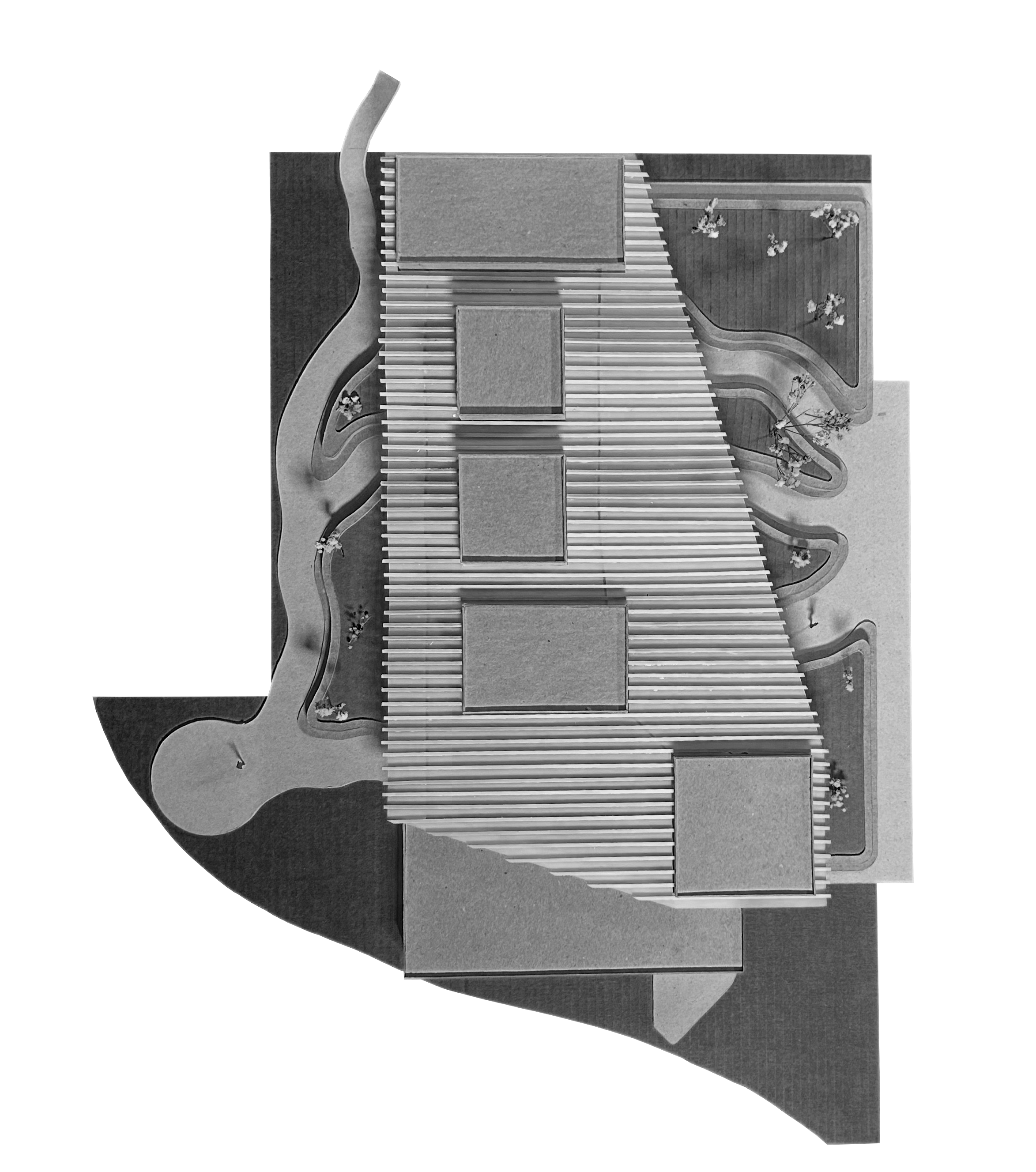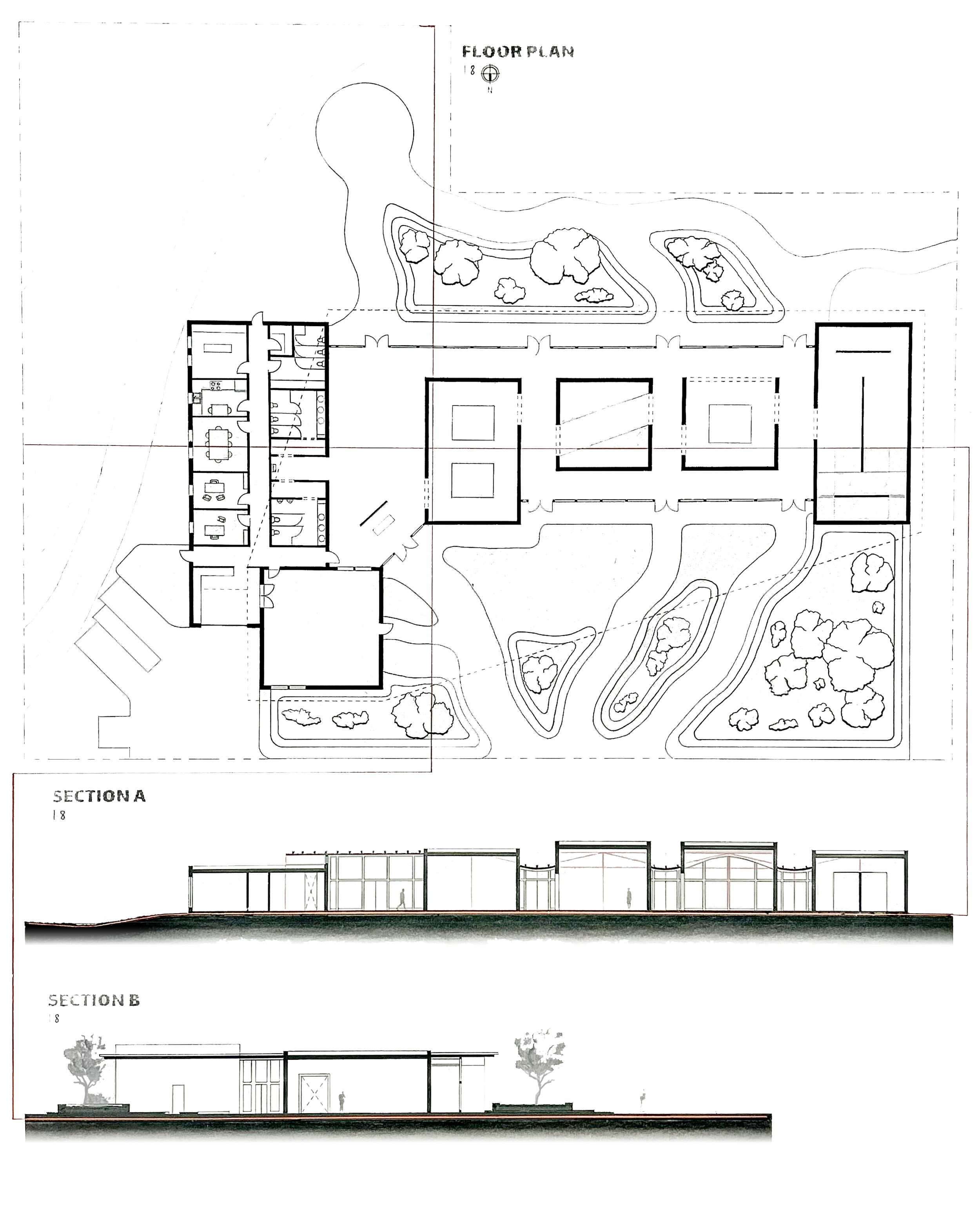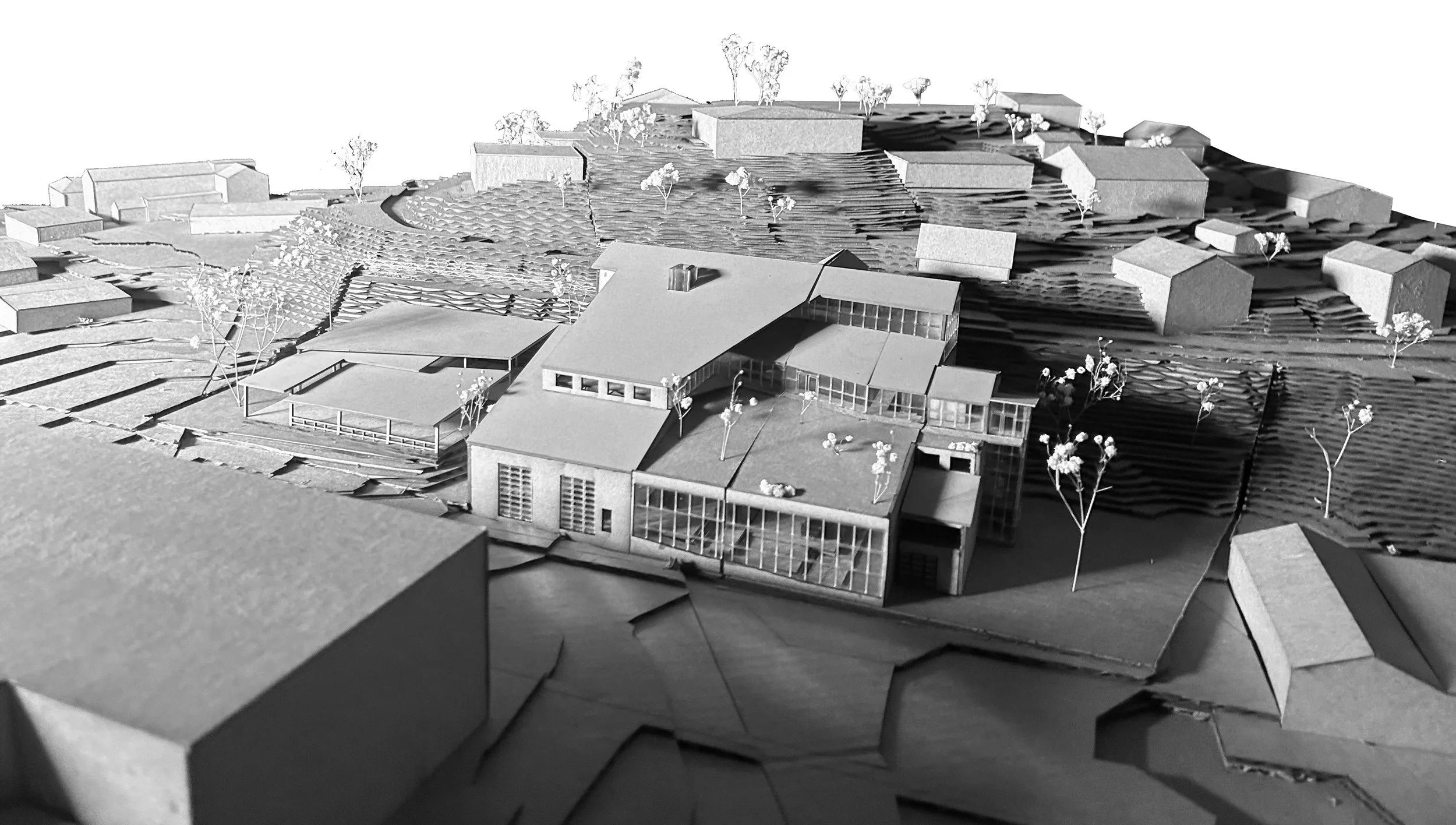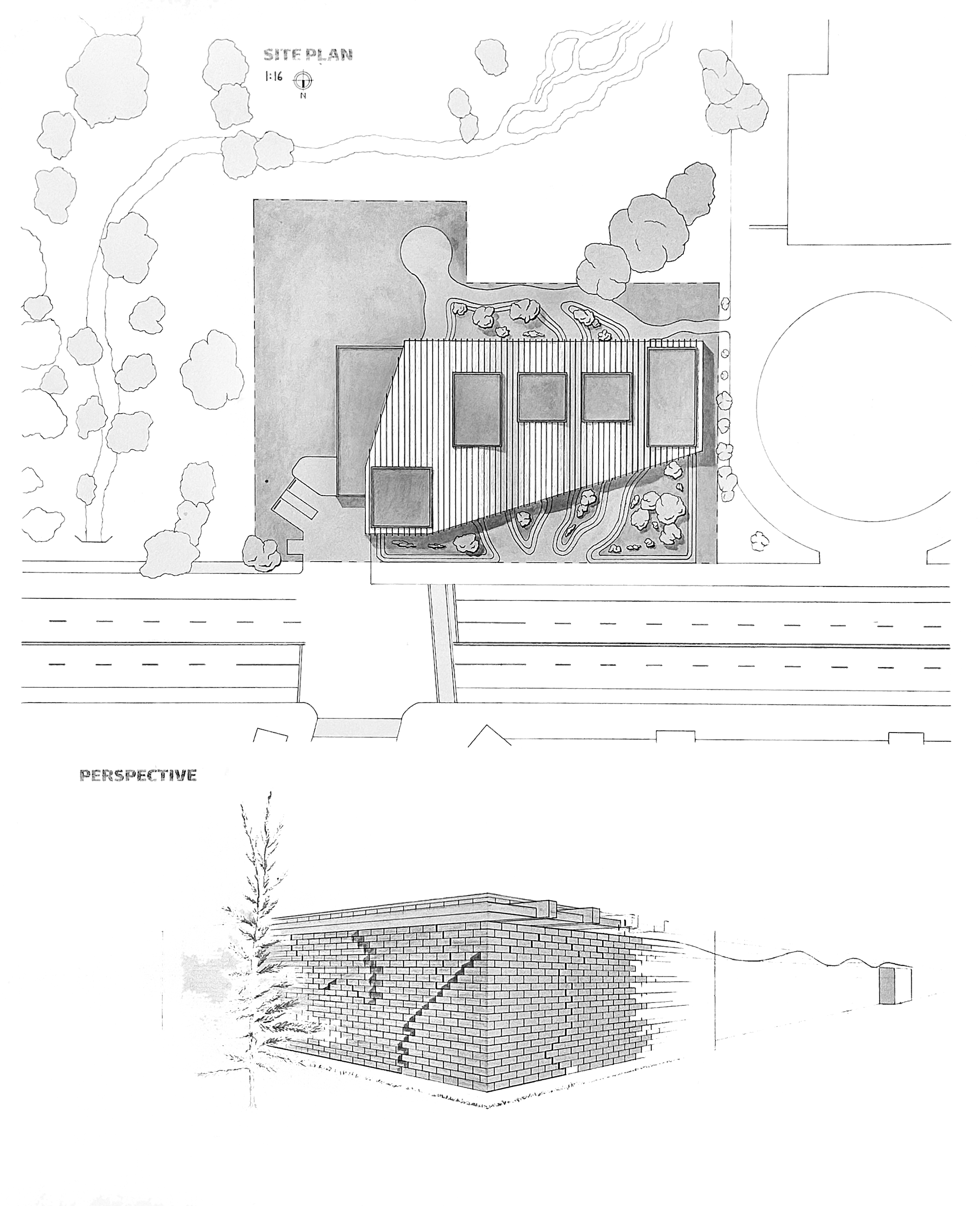 This gallery, designed specifically to showcase the art work of Tara Donovan Embodies her artistic process. She is known for creating natural mimicry through the use of everyday objects. This galley consists of exhibit spaces with different lighting and spacial qualities to conform to her varying art types. the layout of the structure mimics the Bridger, Gallatin, and Madison ranges. The translucent roof structure is representational of undulating clouds falling into mountain valleys. The convergent foot path at the entrance of the site is a subtle reference to the convergence of the Gallatin, Madison, and Jefferson rivers.